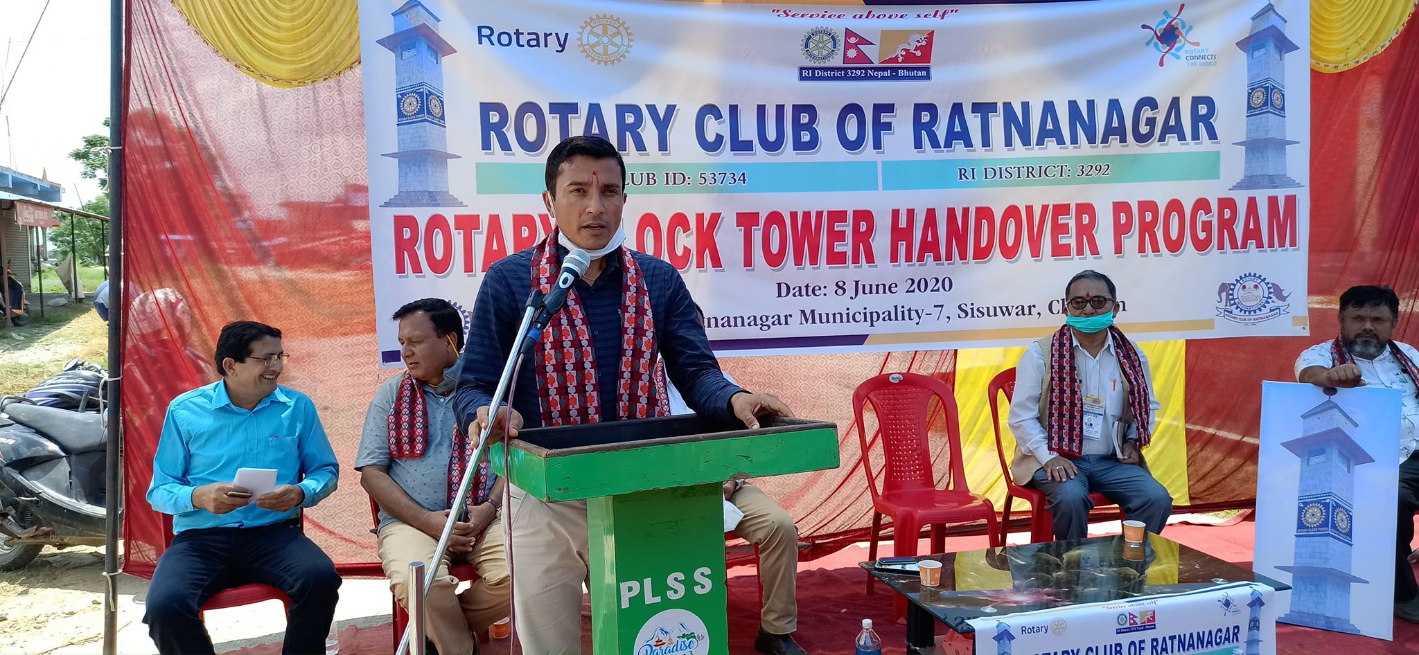 क्लबका अध्यक्ष बिपिन पोख्रेलले उक्त टावर नेपालकै पहिलो रोटरी क्लब टावर रहेको र पर्यटकीय नगरी सौराहा प्रवेश गर्दा बाटोमा पर्ने भएकाले सो टावरले सौराहाकोनै सौन्दर्यता थपेको जिकिर गर्दै अबको टावरको संरक्षणको जिम्मा वडा नं. ७ को कार्यालय र त्यहाका स्थानीय बासीन्दाको भएको बताए । उनले रोटरी क्लब अफ रत्ननगरले टिकौलीमा सार्वजजिक सौचालय निर्माण, मुसहर बस्ति निर्माण साथै क्लक टावर निर्माण लगाएतको काम सम्मन्न गरेकोमा खुसी ब्यक्त गर्दै आगामी दिनमा पनि यस्तै सामाजिक काममानै लागि रहने प्रतिबद्धता पनि प्रकट गरे ।