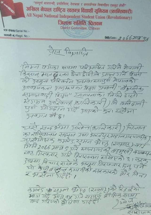 उक्त संगठनले बुधबार एक विज्ञप्ती जारी गर्दै श्रेष्ठको रिहाइको माग गर्दै शैक्षिक संस्था बन्दकाे आब्हान गरिएको जनाएको छ । श्रेष्ठलाई प्रहरीले भरतपुरको सप्तगण्डकी क्याम्पस चोकबाट पपक्राउ गरेको थियो । उनलाई प्रहरीले म्याद थप गरी कारवाहीकाे प्रकृया पनि अघि बढाएको छ ।