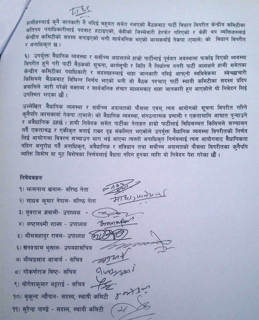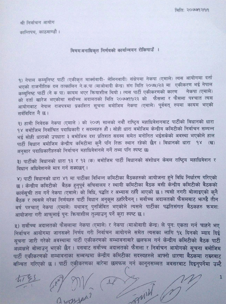 निर्वाचन आयोगमा खनाल–नेपाल समूहले दिएको पत्र यस्तो रहेको छ ः