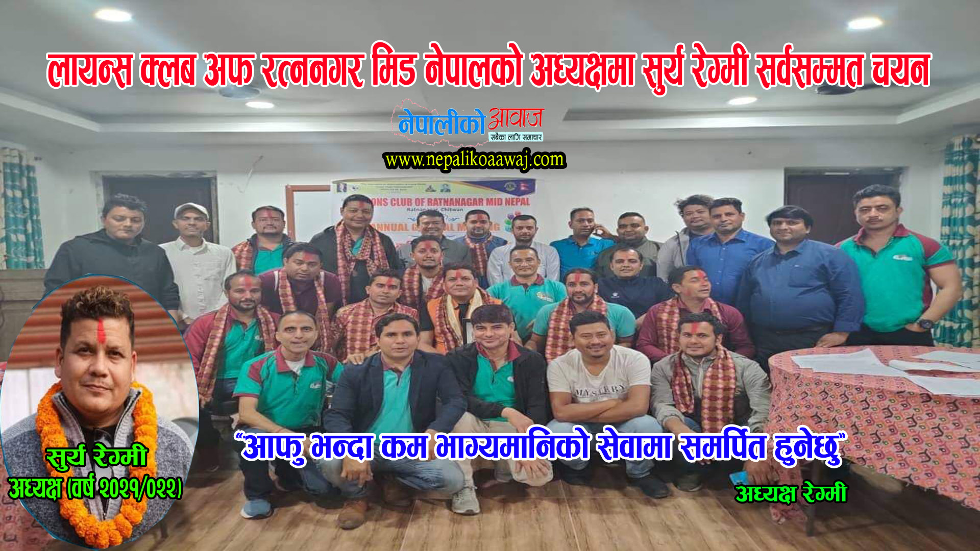 चितवन । पूर्वी चितवनमा रहेको क्लबहरु मध्य अग्रिणी क्लबको रुपमा रहेको लायन्स क्लब अफ रत्ननगर मिड नेपालको अध्यक्षमा सुर्य रेग्मी सर्वसम्मत चयन भएका छन् । शुक्रबार सौराहामा सम्पन्न संस्थाको छैठौं साधारण सभा तथा अधिवेशनबाट रेग्मी सर्वसम्मत अध्यक्षमा चयन भएका हुन् ।
