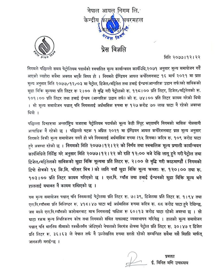 १ अप्रिल २०२१ मा इन्डियन आयल कर्पोरेसनबाट प्राप्त मूल्यअनुसार निगमले मूल्य समायोजन गरेको हो । पछिल्ला दिनहरुमा अन्तर्राष्ट्रिय बजारमा पेट्रोलियम पदार्थको मूल्य स्थिर रहेको भएतापनि मासिक नोक्सानी अत्यधिक रहेको बताउदै निगमले निरन्तर मुल्य बृद्धि गरिरहेको छ । आयल निगमको स्वचालित मूल्य प्रणाली कार्यान्वयन कार्यविधिले निर्दिष्ट गरेअनुसार आइतबार राति १२ बजेबाट लागू हुने गरी मूल्य बढेको हो । निगमले खाना पकाउने ग्याँस तथा हवाई इन्धनको बिक्री मूल्य भने हाललाई यथावत् नै राखिएको जनाएको छ ।