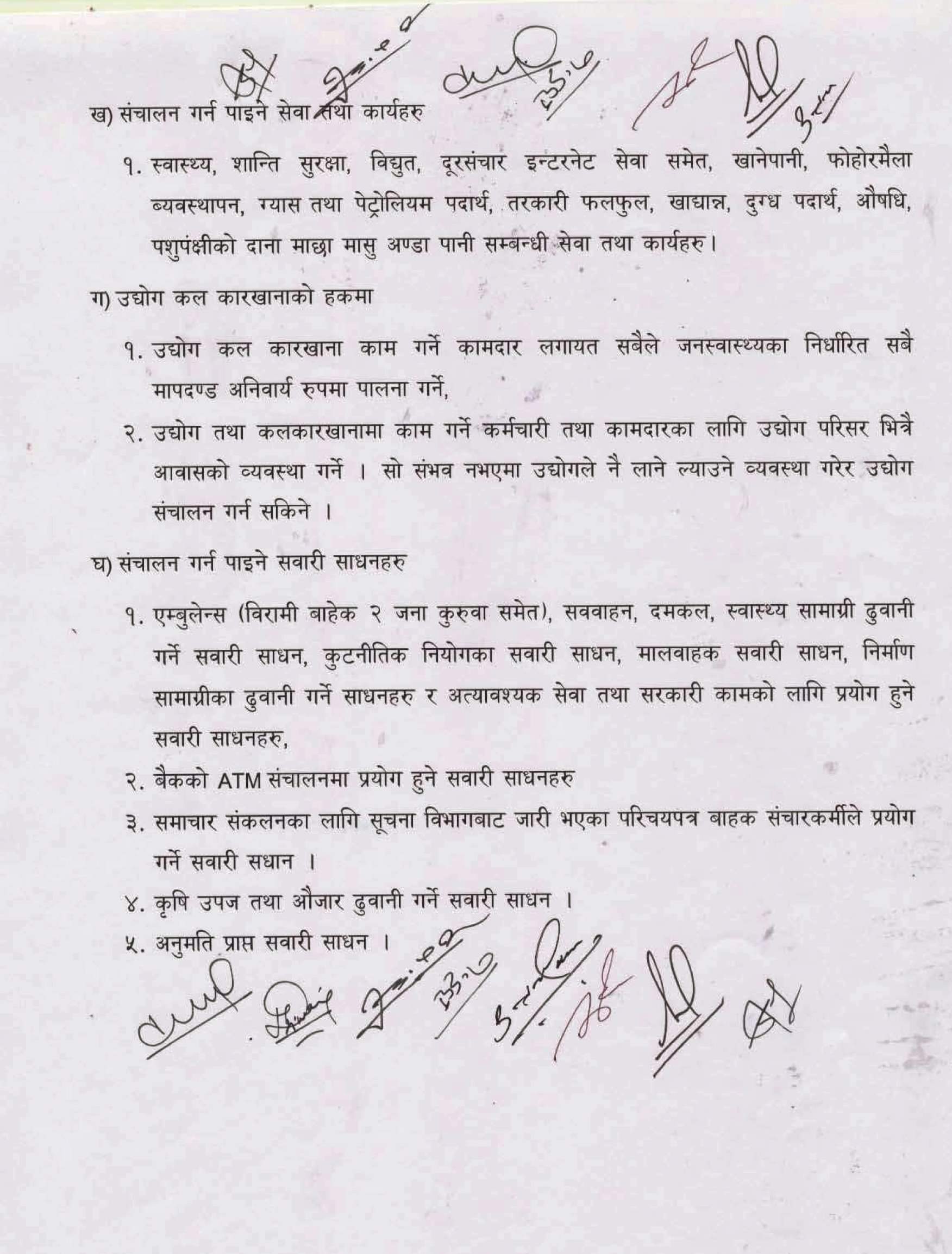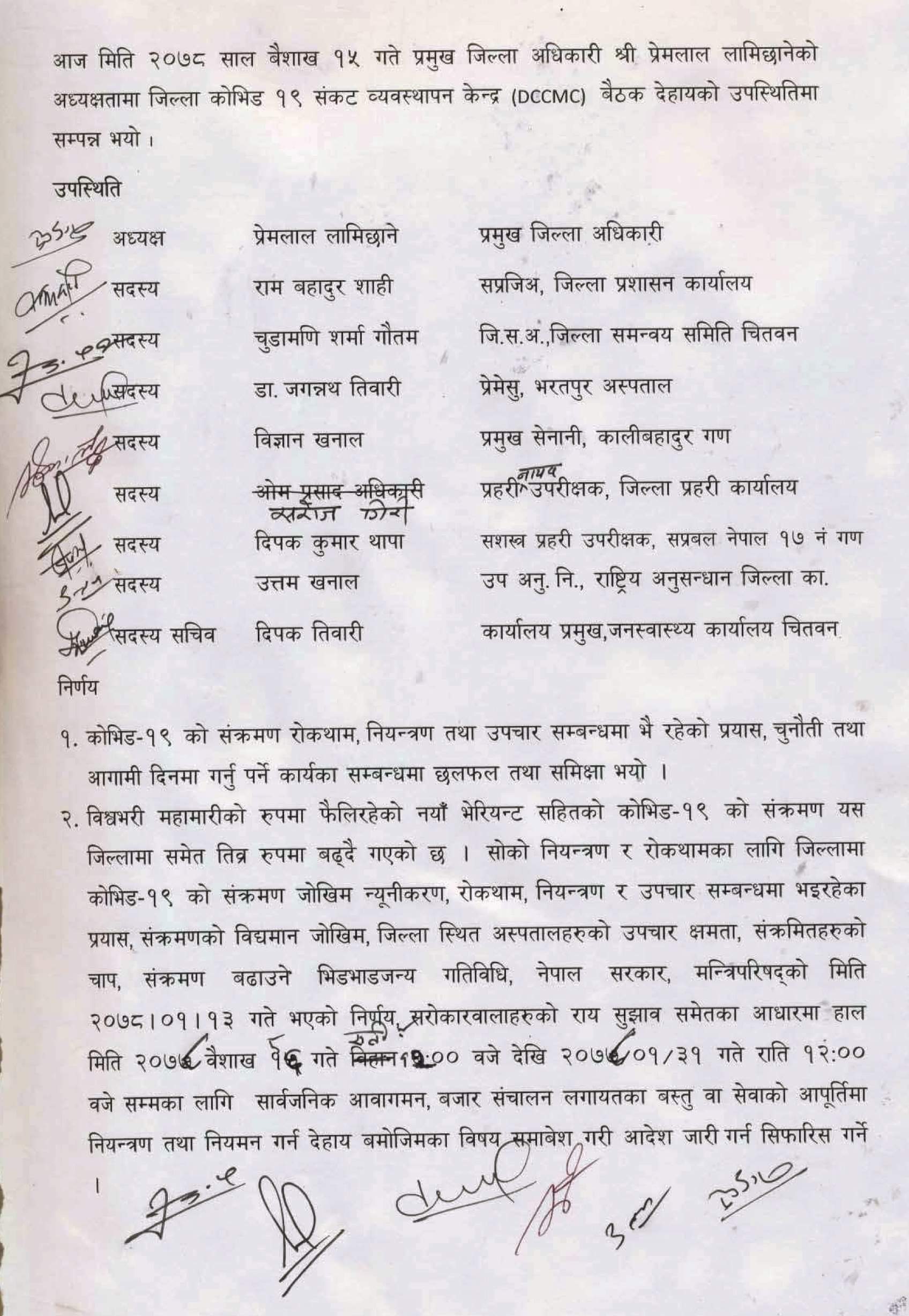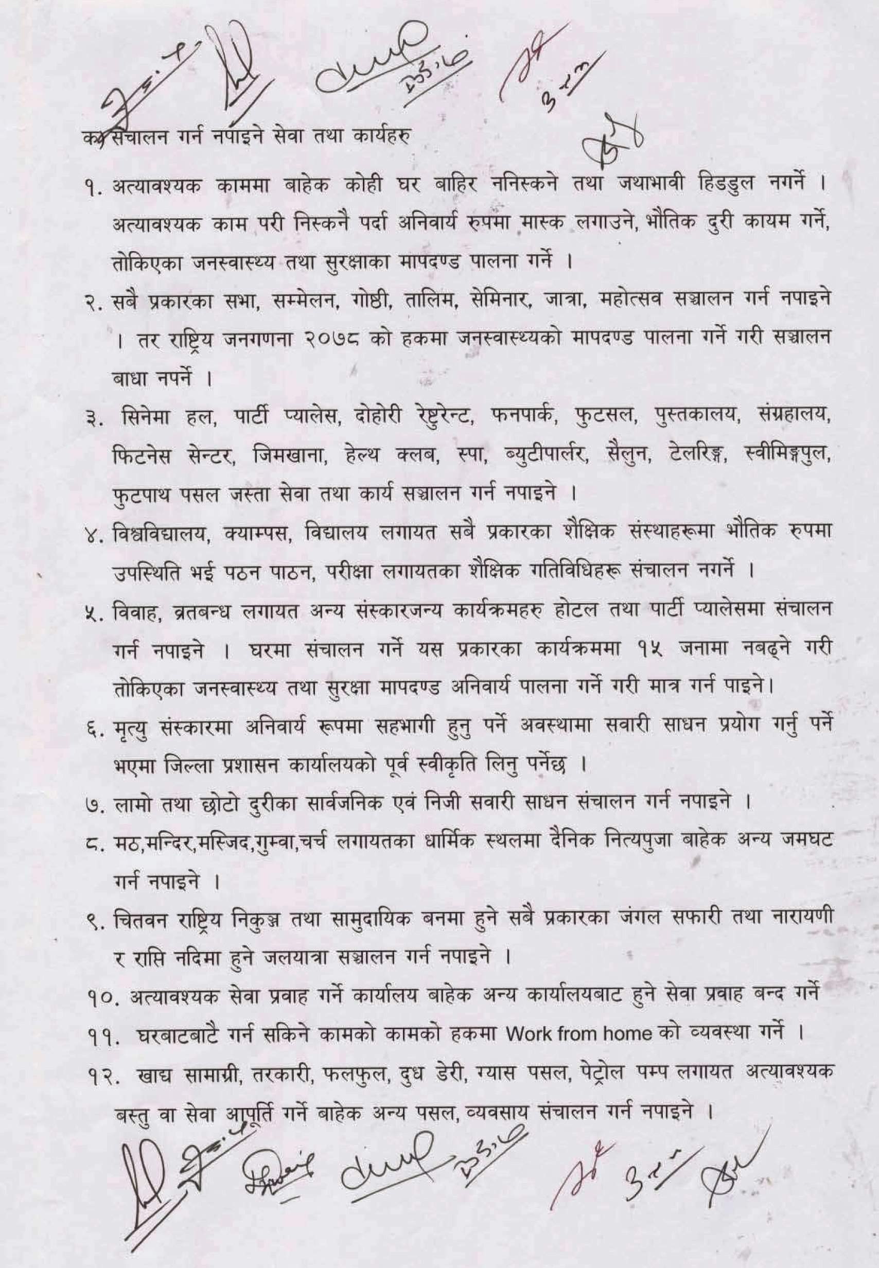 बिहीबार मध्य राति १२ बजेदेखि १५ दिन अर्थात बैशाख ३१ गते सम्मकाे लागि निशेधाज्ञा जारी गर्ने निर्णय जिल्ला काेभिड १९ संकट ब्यवस्थापन समितिकाे आज (बुधबार) बसेकाे बैठकले गरेकाे हाे ।