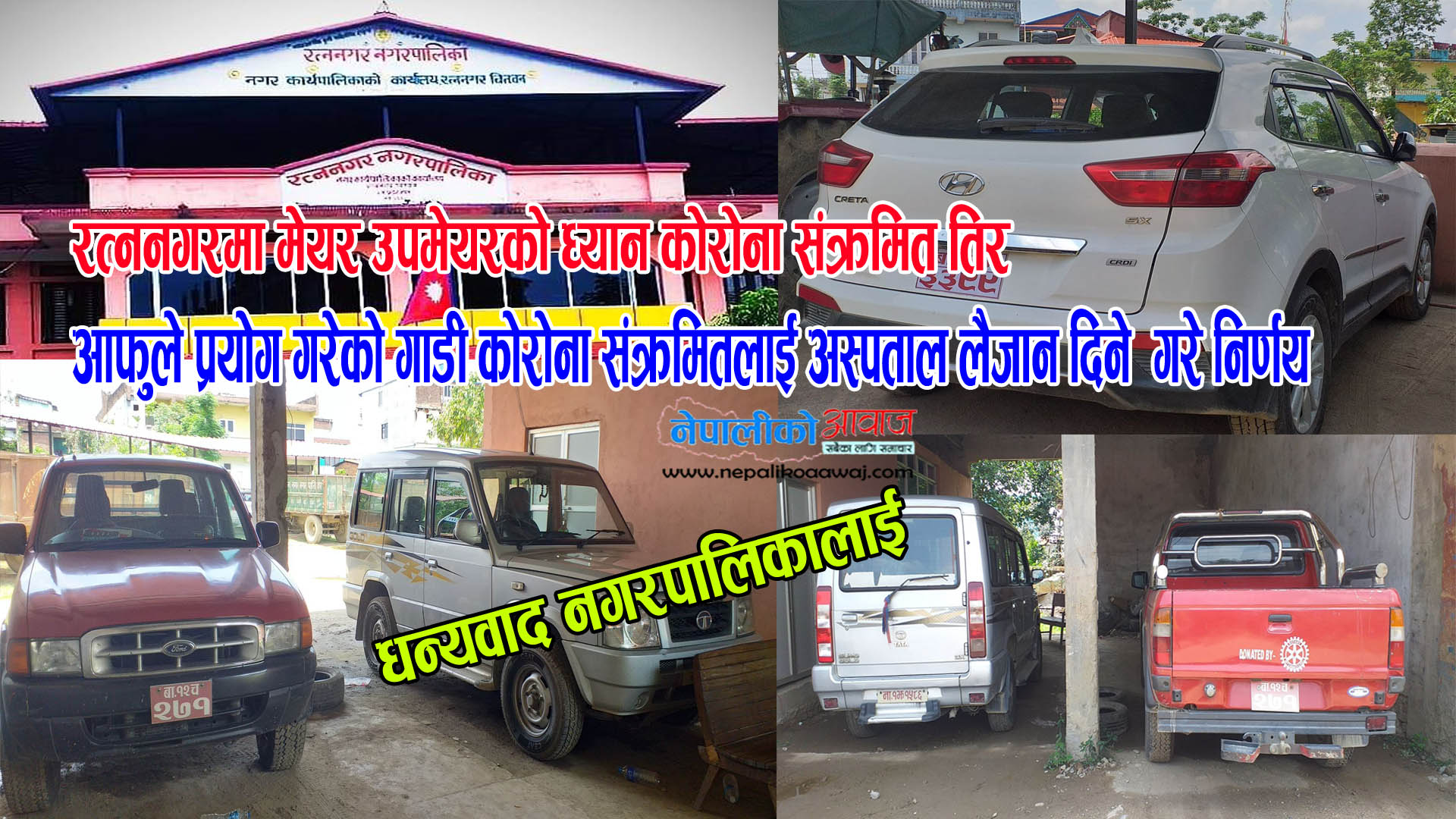 चितवन । चितवनको रत्ननगर नगरपालिकाका मेयर,उपमेयर तथा प्रमुख प्रशासकीय अधिकृतले चढ्ने गाडी कोरोना संक्रमितका लागि प्रयोग गरिने भएको छ । कोरोना संक्रमितको संख्या बढ्दै गएपछि मेयर नारायण वन,उपमेयर विमला दुवाडी,प्रमुख प्रशासकीय अधिकृत शिशिर पौडेल र योजना शाखाका कर्मचारीहरुले प्रयोग गर्दै आएको अर्को एउटा गरी चार वटा गाडी कोरोना संक्रमित विरामीलाई अस्पताल लैजान प्रयोग गरिने भएको हो ।