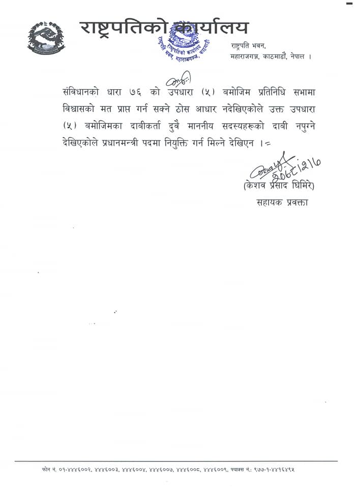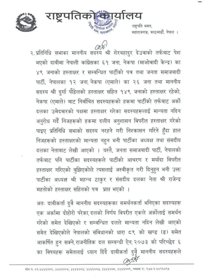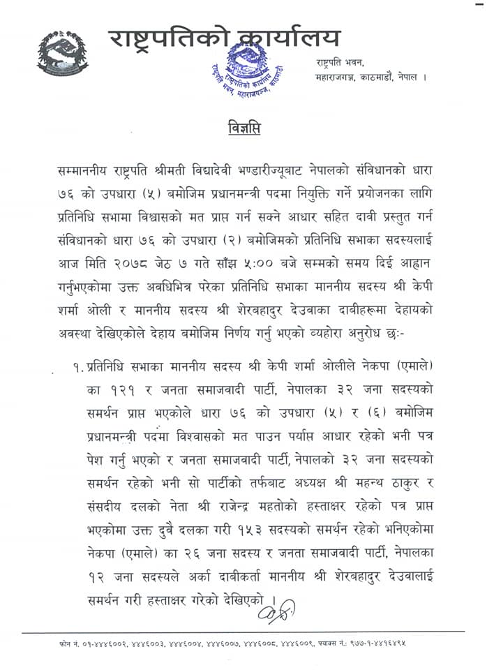 राष्ट्रपतिले संविधानको धारा ७६(५) अनुसार प्रधानमन्त्री नियुक्तिका लागि संसदको विश्वासको मत प्राप्त गर्ने आधार पेश गर्न आह्वान गरेपछि ओली र देउवाले शनिवार दाबी पेश गरेका थिए । देउवाले आफ्नो दल कांग्रेसका ६१, माओवादी केन्द्रका ४९, एमाले माधव नेपाल समूहका २६, जसपा उपेन्द्र यादव समूहका १२ र राष्ट्रिय जनमोर्चाका एक गरी १४९ सांसदको हस्ताक्षरसहित प्रधानमन्त्री नियुक्तिका लागि दाबी गरेका थिए । उता ओलीले भने एमालेका १२१ र जसपाका ३२ गरि १५३ जना सांसदले आफूलाई साथ दिने दाबी गरेका थिए ।