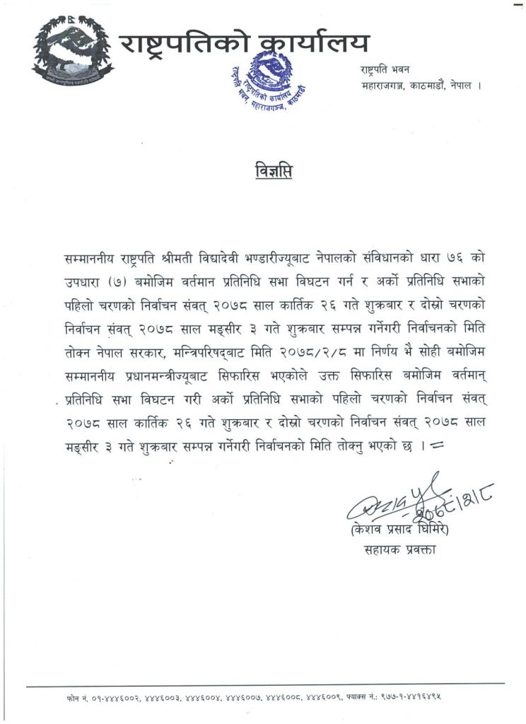 काठमाडौं । राष्ट्रपति विद्यादेवी भण्डारीले मध्यरातमा प्रतिनिधिसभा विघटन गरेर मध्यावधि चुनाव घोषणा गरेकी छन् । मन्त्रिपरिषद्को सिफारिसमा उनले मध्यरातमा प्रतिनिधिसभा विघटन गरेर प्रतिनिधिसभा सदस्यका लागिनै कात्तिक २६ र मंसिर ३ गते गर्ने गरी दुई चरणमा चुनाव घोषणा गरेकी हुन् ।