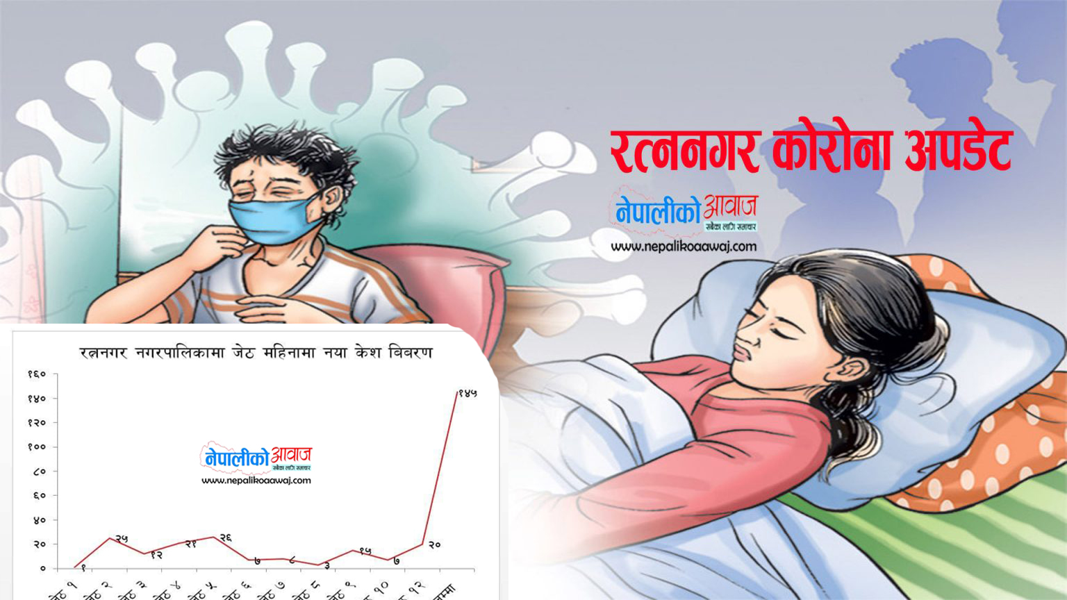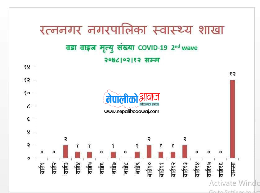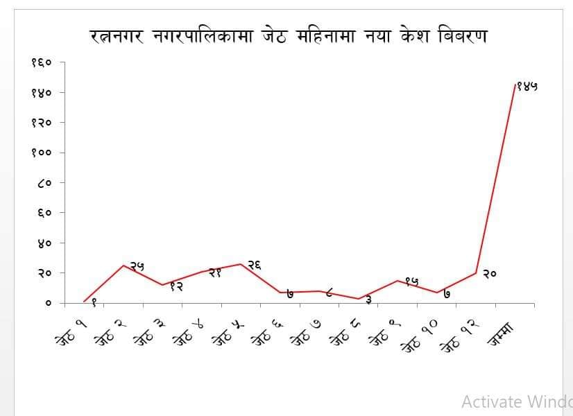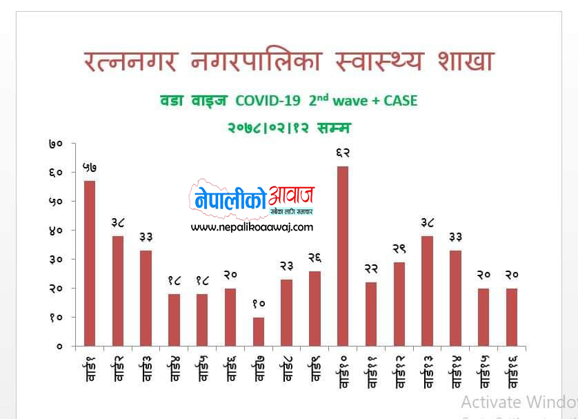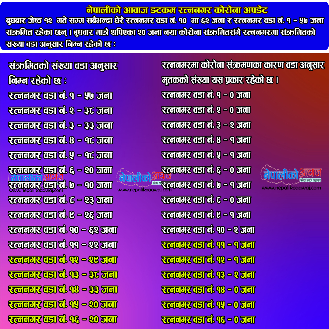 बुधबार अर्थात जेष्ठ १२ गते एकै दिन २० जना कोरोना संक्रमित थपिएसंगै कोरोनाको यो दोस्रो लहरमा संक्रमितको संख्या रत्ननगरमा ४६७ पुगेको हो । बुधबार थपिएका कोरोना संक्रमितसँगै रत्ननगरमा कोरोनाको दोस्रो लहर अर्थात बैशाख ३ गते देखि यता जेष्ठ १२ गते सम्ममा संक्रमितको संख्या ४६७ पुगेको हो । जसमा २९५ जना संक्रिय संक्रमित, २८१ जना होम आइसोलेसनमा, १२ जना हस्पिटलमा र २ जना नगरको आइसोलेसन अर्थात बकुलहर रत्ननगर अस्पतालमा रहेका छन् भने १६० जनाले कोरोनालाई जित्न सफल भएका छन् । जसमा २०० जना महिला अर्थात ४५ प्रतिशत र पुरुष २४७ अर्थात ५५ प्रतिशत रहेका छन् । हालसम्म कोरोनाको यो दोस्रो लहरमा १२ जनाको कोरोनाकोनै कारणले मृत्यु भइसकेको छ ।
