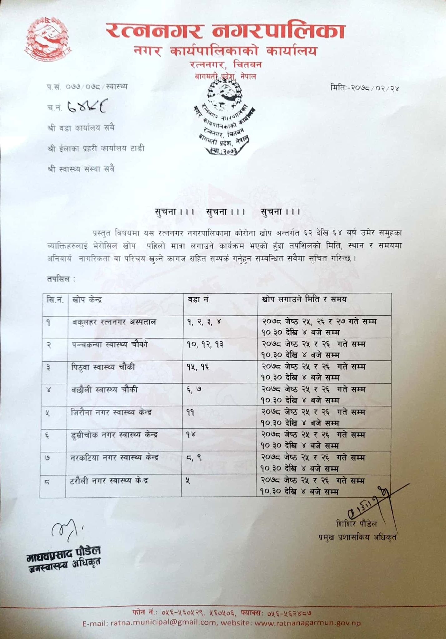 रत्ननगर नगरपालिकाका १६ वटै वडामा रहेका ६२ वर्षदेखि ६४ वर्षसम्मका उमेर समूहलाई कोरोना बिरुद्धको पहिलो मात्राको भेरोसिल खोप लगाइने रत्ननगर नगरपालिकाका स्वास्थ्य शाखा प्रमुख माधव पौडेलले नेपालीको आवाज डटकमलाई जानकारी दिए । उनले त्यसको लागि वडा अनुसार खोप लगाउनको लागि स्वास्थ्य केन्द्र तोकिएको जानकारी पनि दिए । उनले सो खोपको लगाउन वडा अनुसार जेठ २५, २६ र २७ गते तोकिएकाले सूचना अनुसार खोप केन्द्रमा उपस्थित हुन आग्रह पनि गरे ।