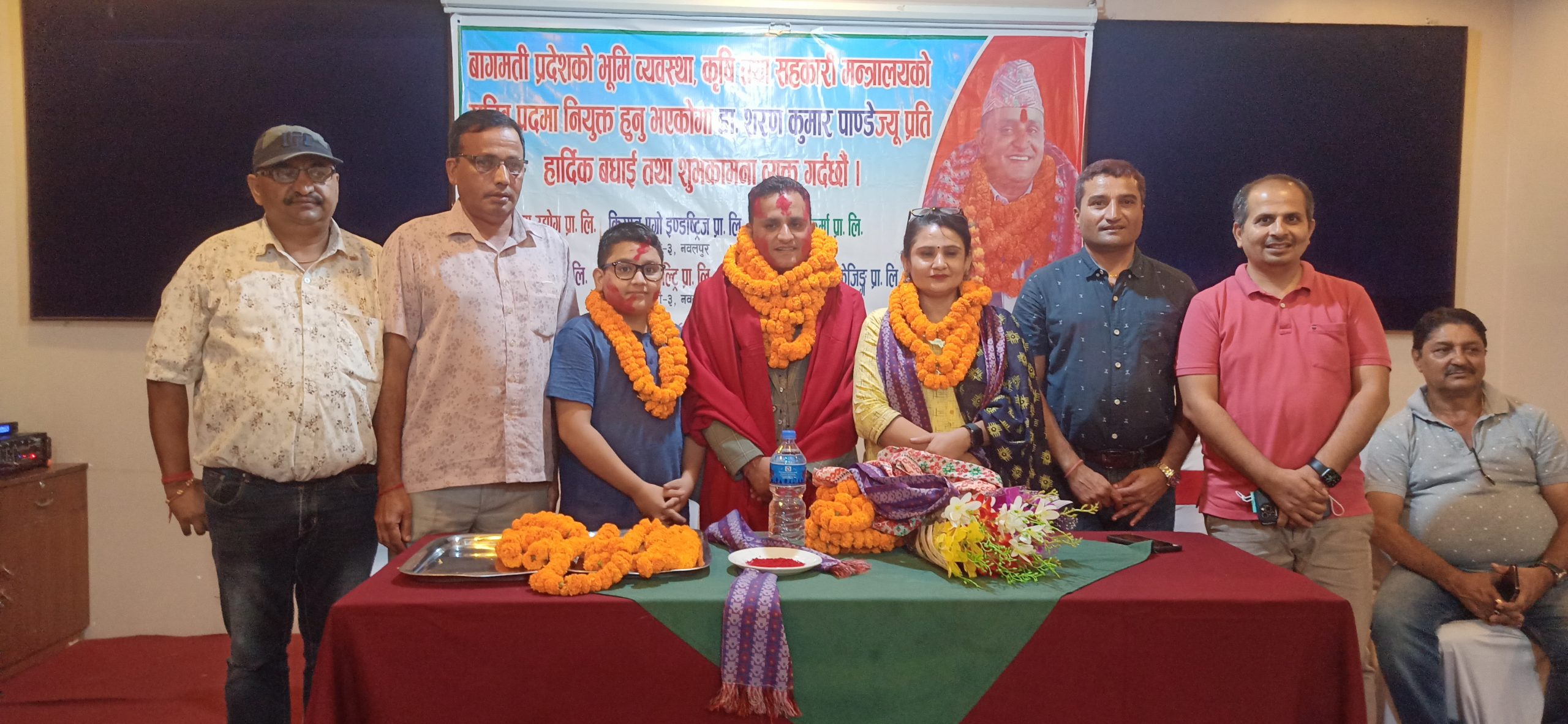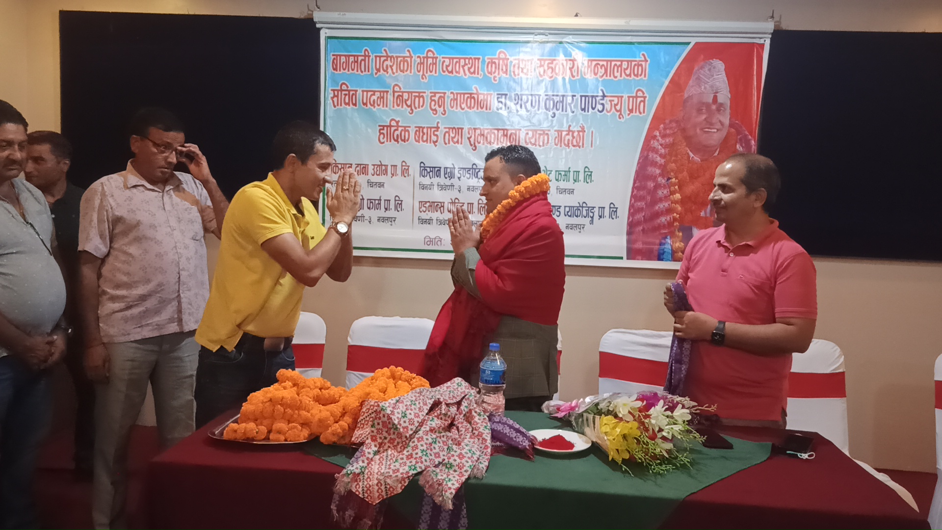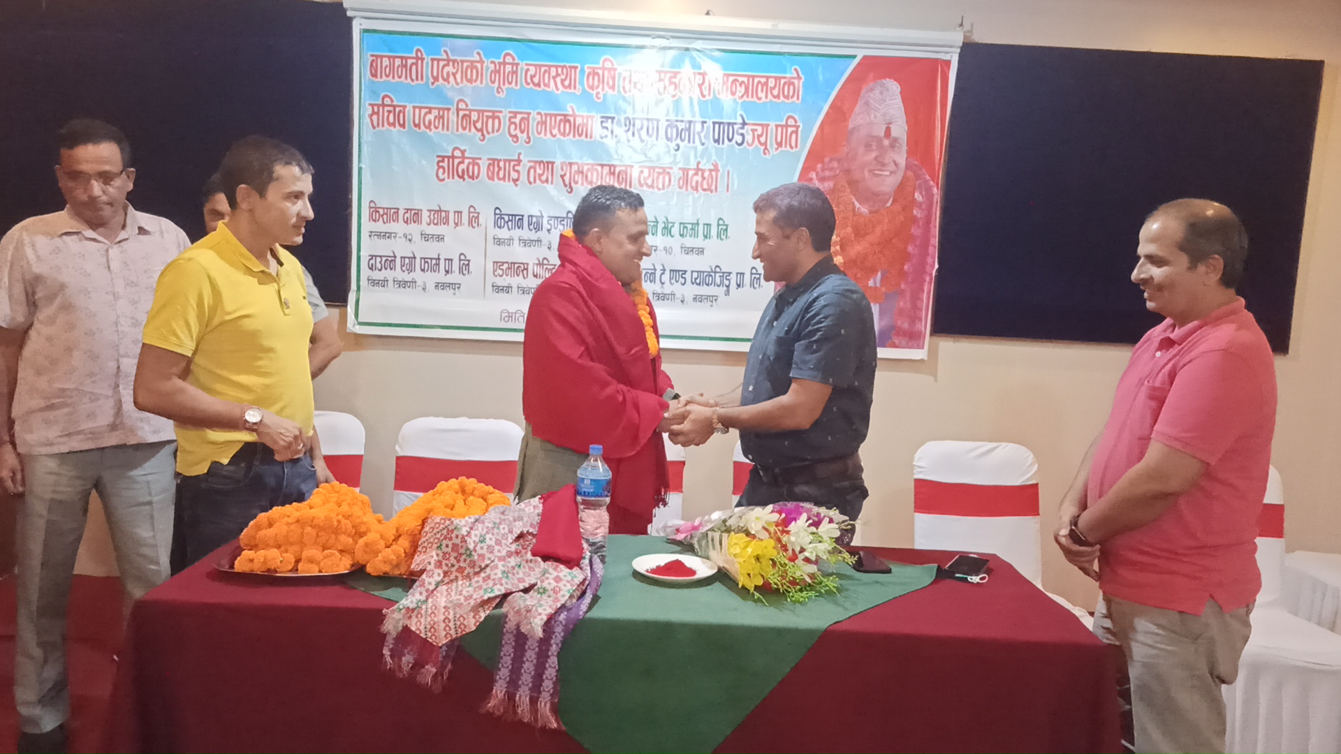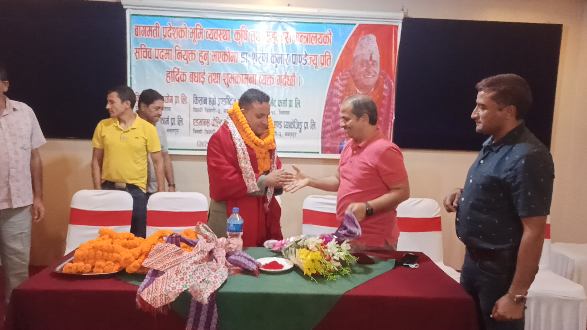 चितवन । बागमती प्रदेशको भूमि ब्यवस्था, कृषि तथा सहकारी मन्त्रालयको सचिव पदमा नियुक्त भएका डा. शरण कुमार पाण्डेलाई किसान दाना तथा दाउन्ने ग्रुपद्धारा स्वागत तथा बधाई कार्यक्रम गरिएको छ ।