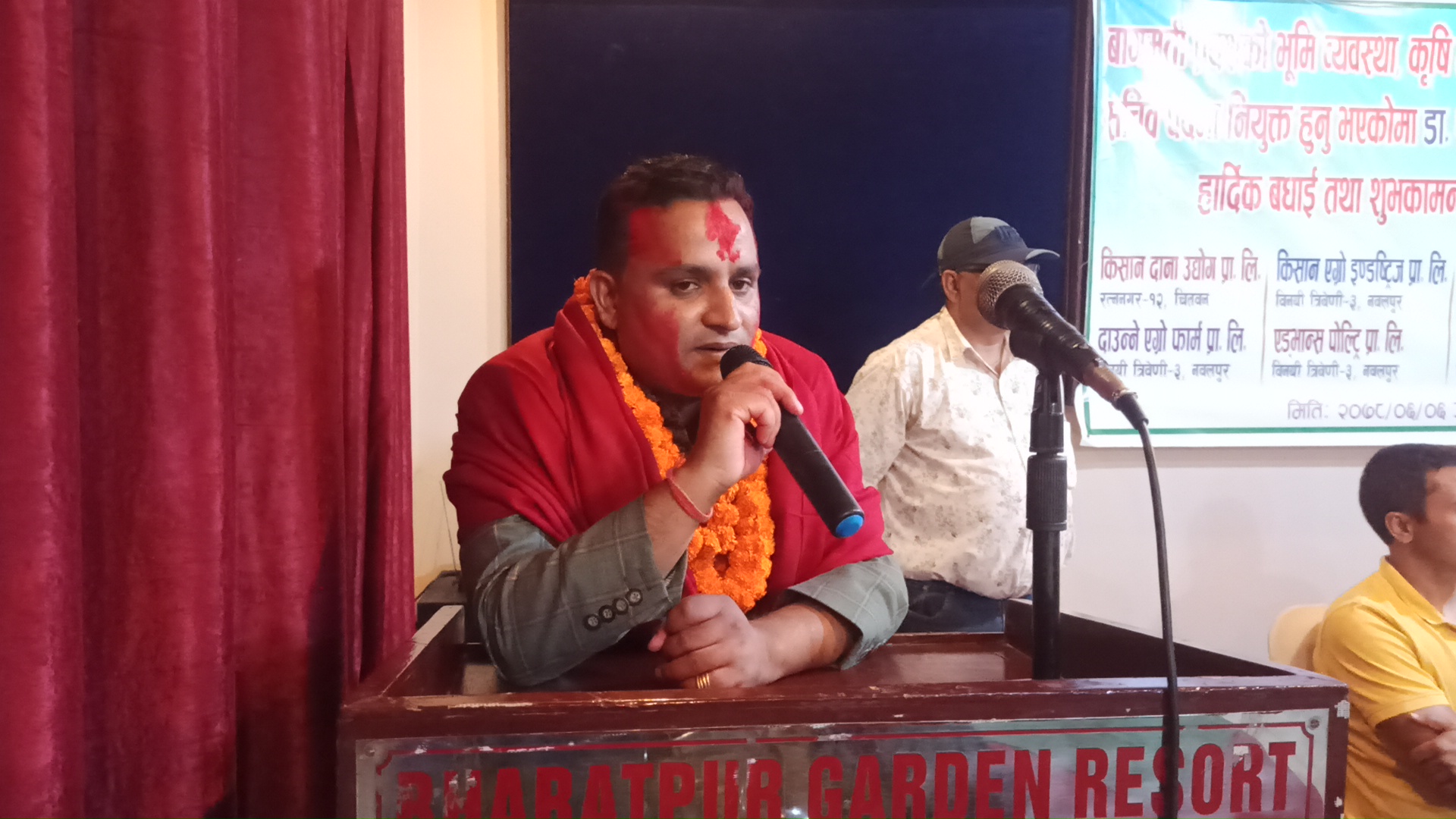 बुधवार भरतपुरमा किसान दाना उद्योग प्रा.लि., किसान एग्रो इण्डस्ट्रिज प्रा.लि., दाउन्ने भेट फर्मा प्रा.लि., दाउन्ने एग्रो प्रा.लि, एडभान्स पोल्ट्रि प्रा.लि, दाउन्ने ट्रे एण्ड प्याकेजिङ्ग प्रा.लि.ले संयुक्त रुपमा कार्यक्रमको आयोजना गरि सचिव डा. शरण पाण्डेलाई स्वागत तथा बधाई कार्यक्रम गरेको हो ।