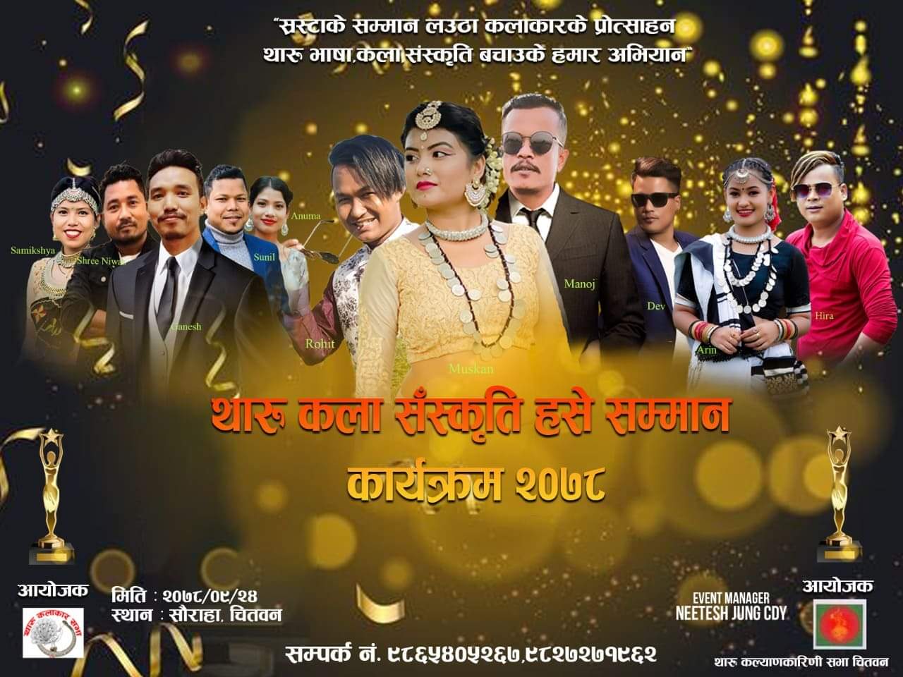 थारु कलाकार सभाको आयोजना तथा थारु कल्याणकारिण सभा चितवनको प्रवद्र्धनमा आयोजना हुन लागेको कार्यक्रममा चितवनका पहिलो थारु चलचित्र निर्माता, पहिलो थारु पत्रकार, पहिलो थारु साहित्यकार, पहिलो नायक नायिका, गायक गायिका, कथा, शब्द, संगीत, चलचित्र निर्देशक, नृत्य निर्देशक, गिती एल्ब, सम्पादक लाई सम्मान गर्न लागिएको थारु कलाकार सभा चितवनका अध्यक्ष सुरेश चौधरीले जानकारी दिनुभयो ।