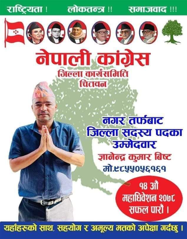 चितवन । नेपाली काँग्रेस चितवन जिल्ला सदस्यमा पर्यटन व्यवसायी ज्ञानेन्द्र कुमार विष्टले उम्मेदवारी घोषणा गरेका छन् । चितवनको पर्यटन विकासमा योगदान दिएका विष्टले पार्टीको माध्यमबाट सामाजिक विकासका काम गर्ने योजना सहित आफ्नो उम्मेदवारी घोषणा गरेका हुन ।