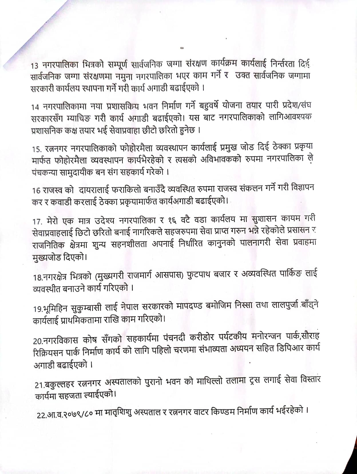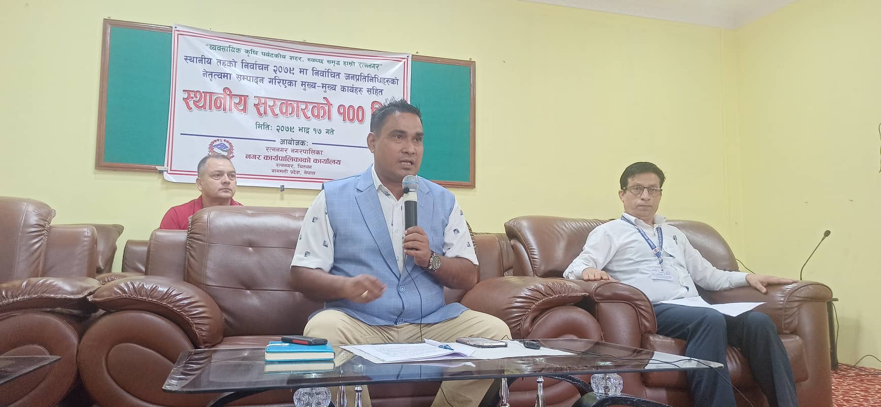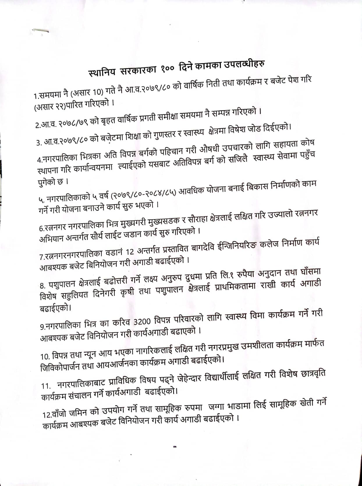 रत्ननगर नगरपालिकाका नगर प्रमुख प्रल्हाद सापकोटाले प्रस्तुत गरेको स्थानिय सरकारका १०० दिने कामको उपब्धिलाई हेरौं ३० बुंदामाः–