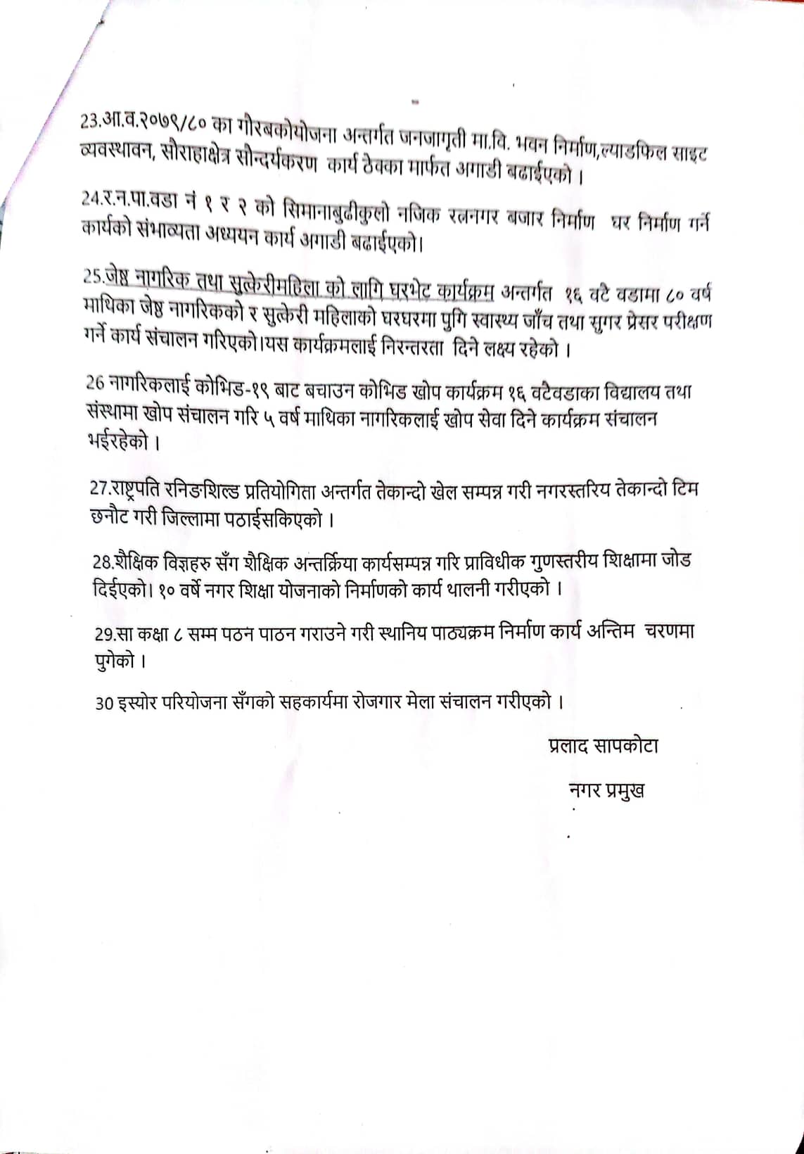 उनले जेष्ठ नागरिक तथा सुत्केरी महिलाको लागि घरभेट कार्यक्रम अन्र्तगत १६ वटै वडामा ८० वर्ष माथिका जेष्ठ नागरिकको र सुत्केरी महिलाको घरघरमा पुगि स्वास्थ्य जाँच तथा सुगर प्रेसर परिक्षण गर्ने कार्य सञ्चालन गरिएको जानकारी दिए । मेयर सापकोटाले शैक्षिक विज्ञहरुसँग शैक्षिक अन्र्तक्रिया कार्य सम्पन्न गरि प्राविधिक गुणस्तरिय शिक्षामा जोड दिइएको बताउदै १० वर्षे नगर शिक्षा योजनाको निर्माणको कार्य थालनी गरिएको जानकारी दिए । उनले नगरमा रहेका बिद्यालयमा ८ कक्षा सम्म पठन पाठन गराउने गरी स्थानिय पाठ्यक्र निर्माणको काम अन्तिम चरणमा पुगेको बताए । मेगर सापकोटाले नगरको बिकासको लागि ५ वर्षे आवधिक योजना बनाई बिकास निर्माणको काम गर्ने गरि योजना बनाउने कार्य सुरु गरिएको जानकारी दिए ।
