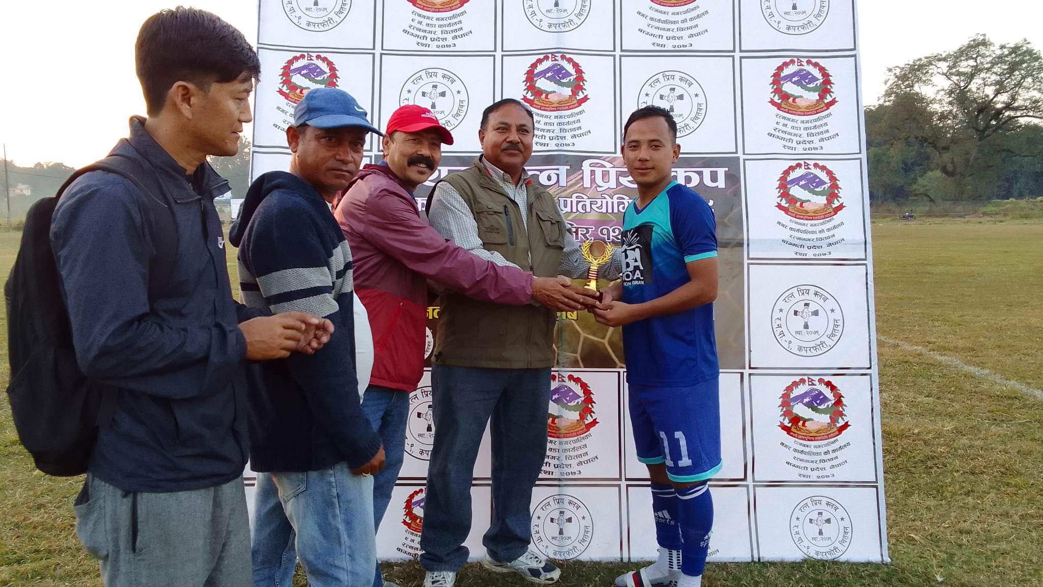 आजको खेलमा भरतपुर फुटबल क्लव जर्सी नम्बर ११ का रोशन राना मगर म्यान अफदि म्याच घोषित भएकाछन् । पूर्व राष्ट्रिय खेलाडी ललित थापा र वडा नं. ९ का वडा अध्यक्ष अनन्त अधिकारीले मगरलाई ट्रफी प्रदान गरे ।