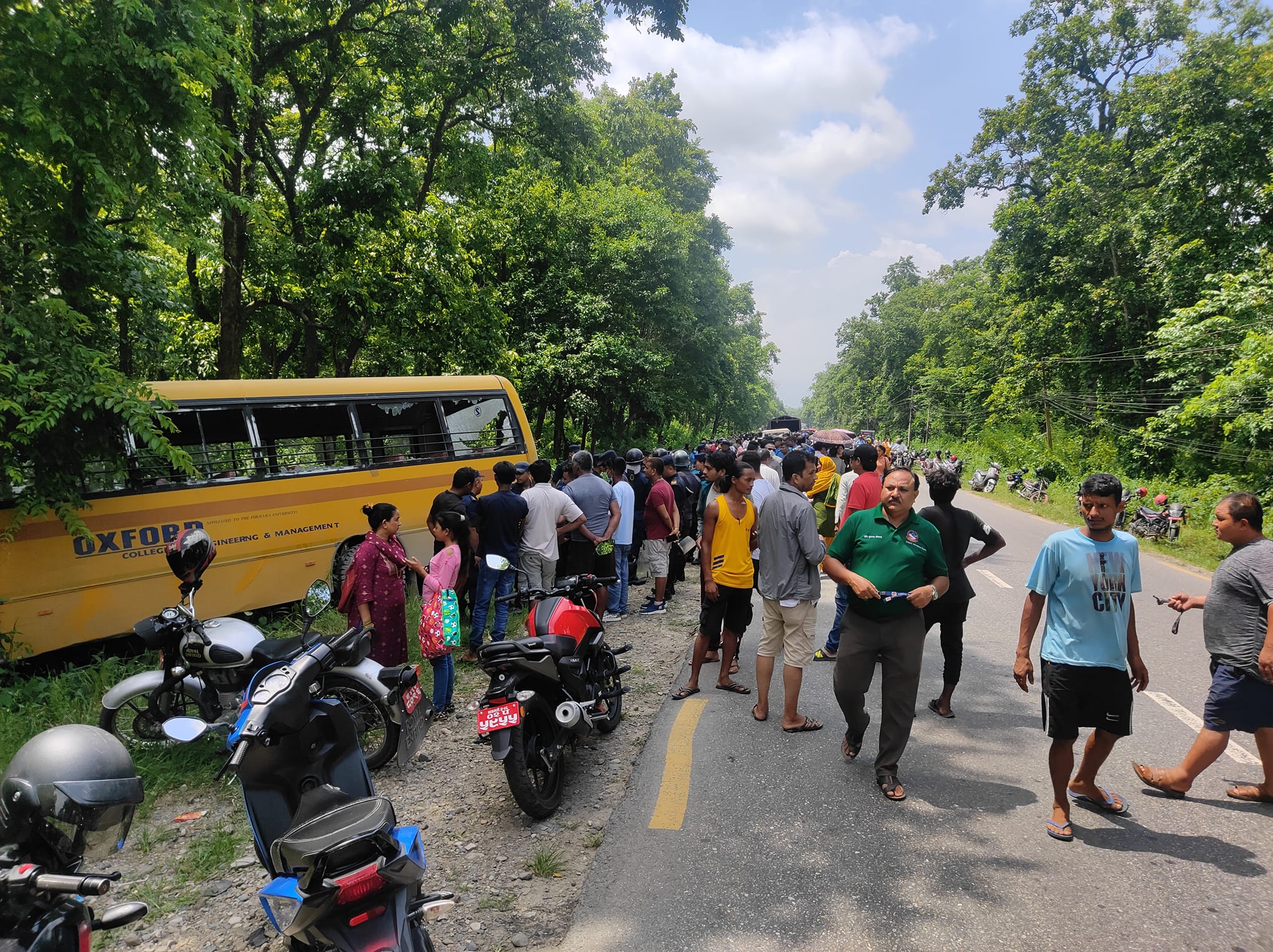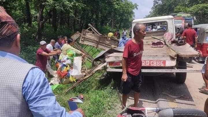 चितवन । आज (बुधवार) बिहान करिब ११:४० बजेको समयमा भरतपुर म.न.पा ९ टिकौली जङ्गलमा भरतपुरबाट टाँडी तर्फ जादै गरेको ना १ क ६१३१ नं.को अक्सफोड कलेजको बसले बिपरित दिशाबाट आउदै गरेको ना २ च ८४४६ नं.को लाश बोकि देवघाट तर्फ जादै गरेको बलेरोलाई ठक्कर दिई बा.प्र.०६-००१प ९९८१,बा.प्र.०३-००५प ९७, ,ना६२ प ६०३२, बा.प्र.०३-००१प ४१४७ मो.सा.हरु , बा.प्र.०६-००१प २२९४ र बा.प्र.०३-००२प ४१९८ नं.को स्कुटर सहित सम्पुर्ण सवारी साधनहरु एक आपसमा ठक्कर खाँदा २० जना घाइते, ७ काे अवस्था गम्भीर रहेकाे प्रहरीले जनाएको छ ।